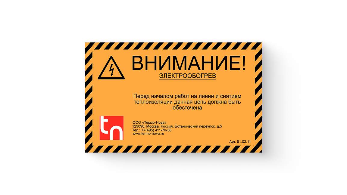 Этикетка «Внимание электрообогрев!» предупреждает о наличии электрообогрева под теплоизоляцией трубопровода или другого оборудования и размещается каждые 3 или 5 метров цепи обогрева.